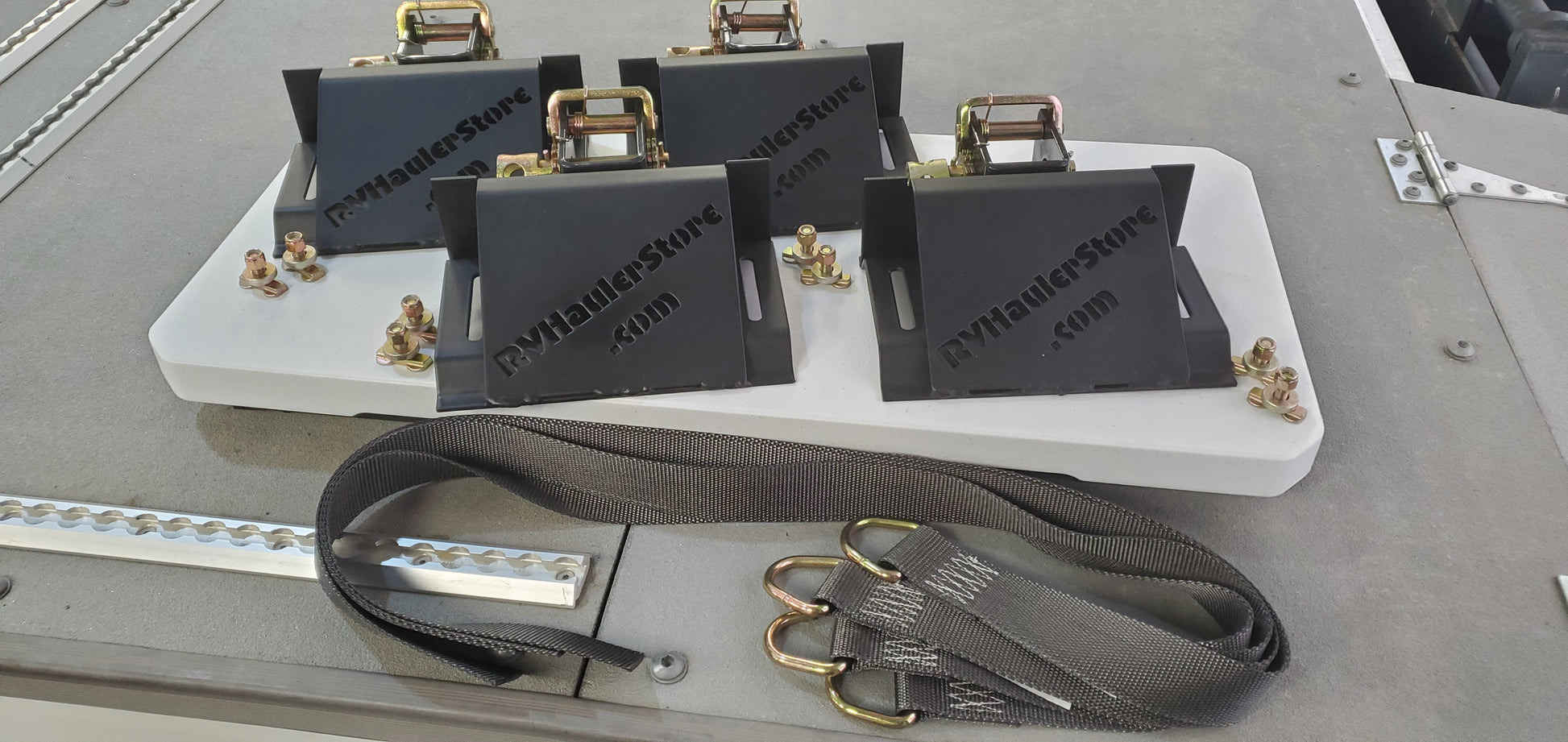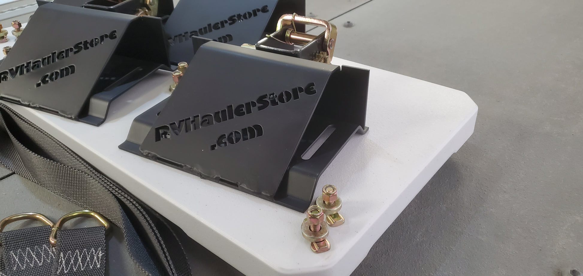 Wheels Chocks, Straps and Mounting Bolts. Set of 4 - Designed to work with surface mount airline tracking (sold separately). Includes mounting bolts and wheel straps 4 feet long. Wheel Straps are professionally manufactured, and are rated and tagged. Each tie down bolt is rated to 1850 lbs (two per chock). Ratchets are rated to 10,000 lbs.