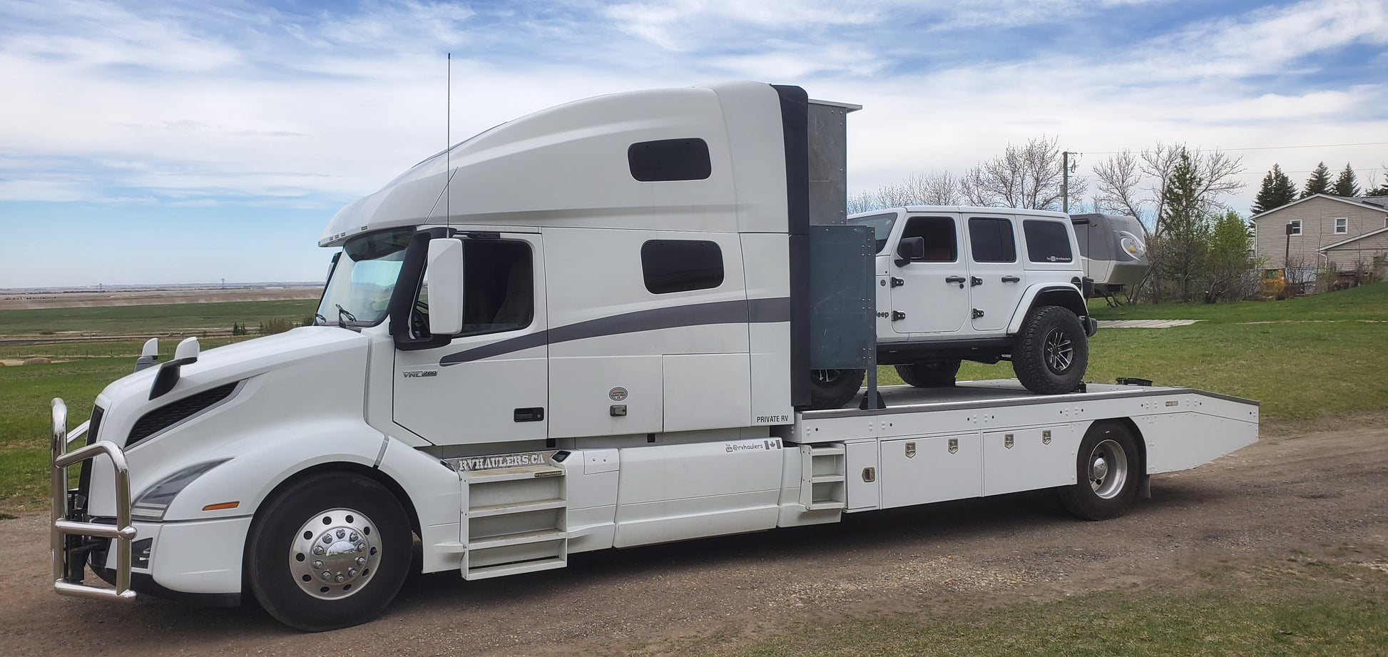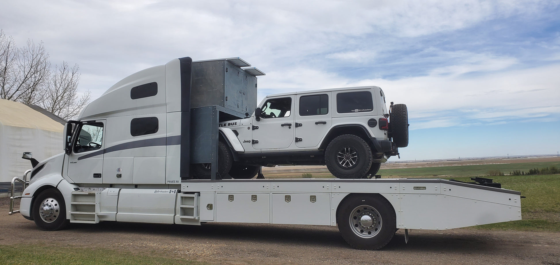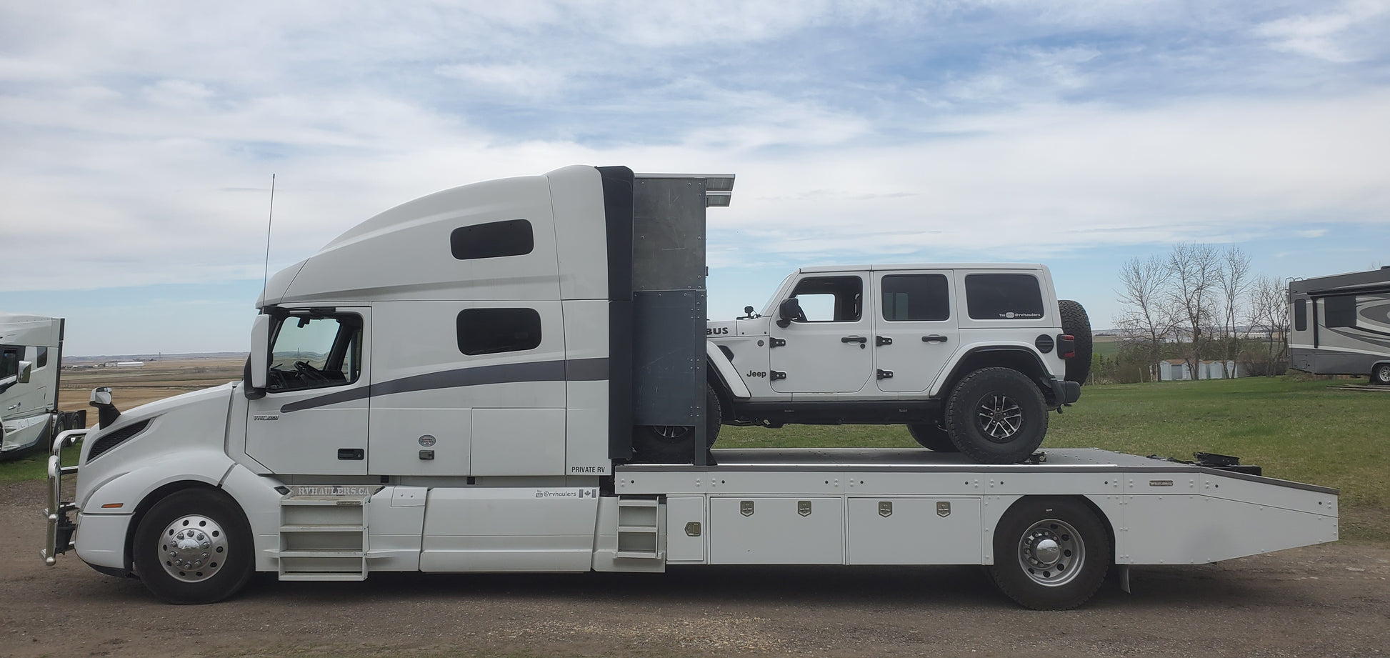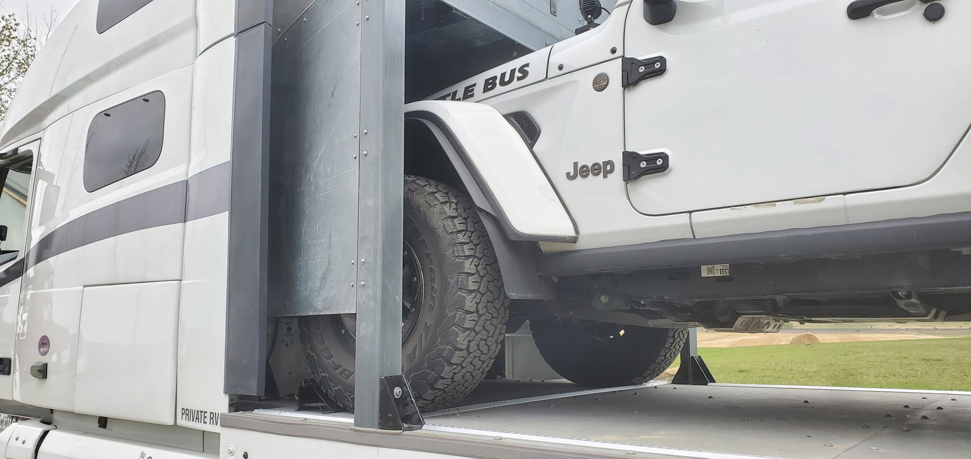 WHY – Some RVHauler builds are looking to keep our length reduced as much as possible, yet still be able to get some storage above the bed. Our “Standard” drom placed behind the back of the cab takes up 16 inches. This allows us to position a vehicle up closer to the back of the cab, and still take some of our necessary treasures in our travels.