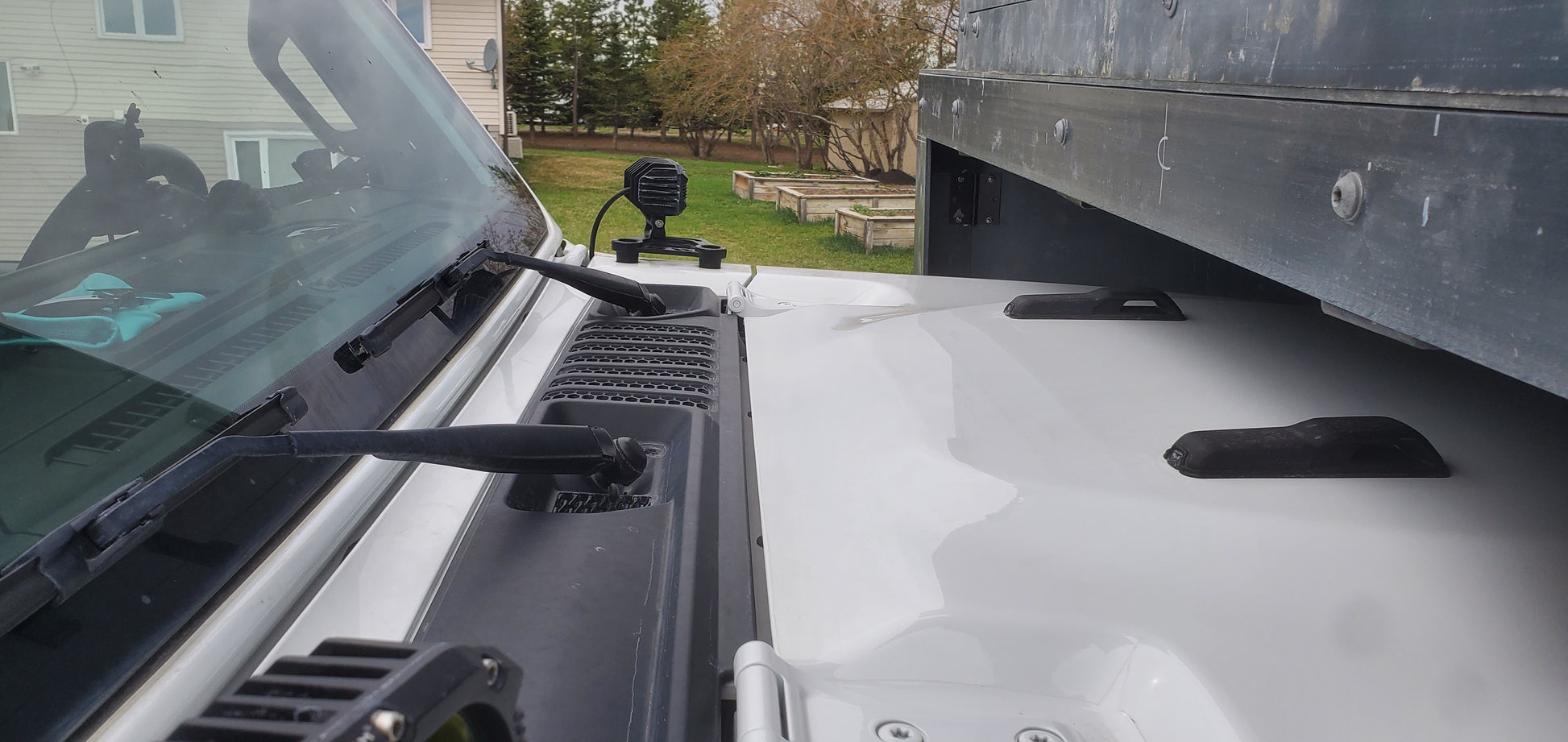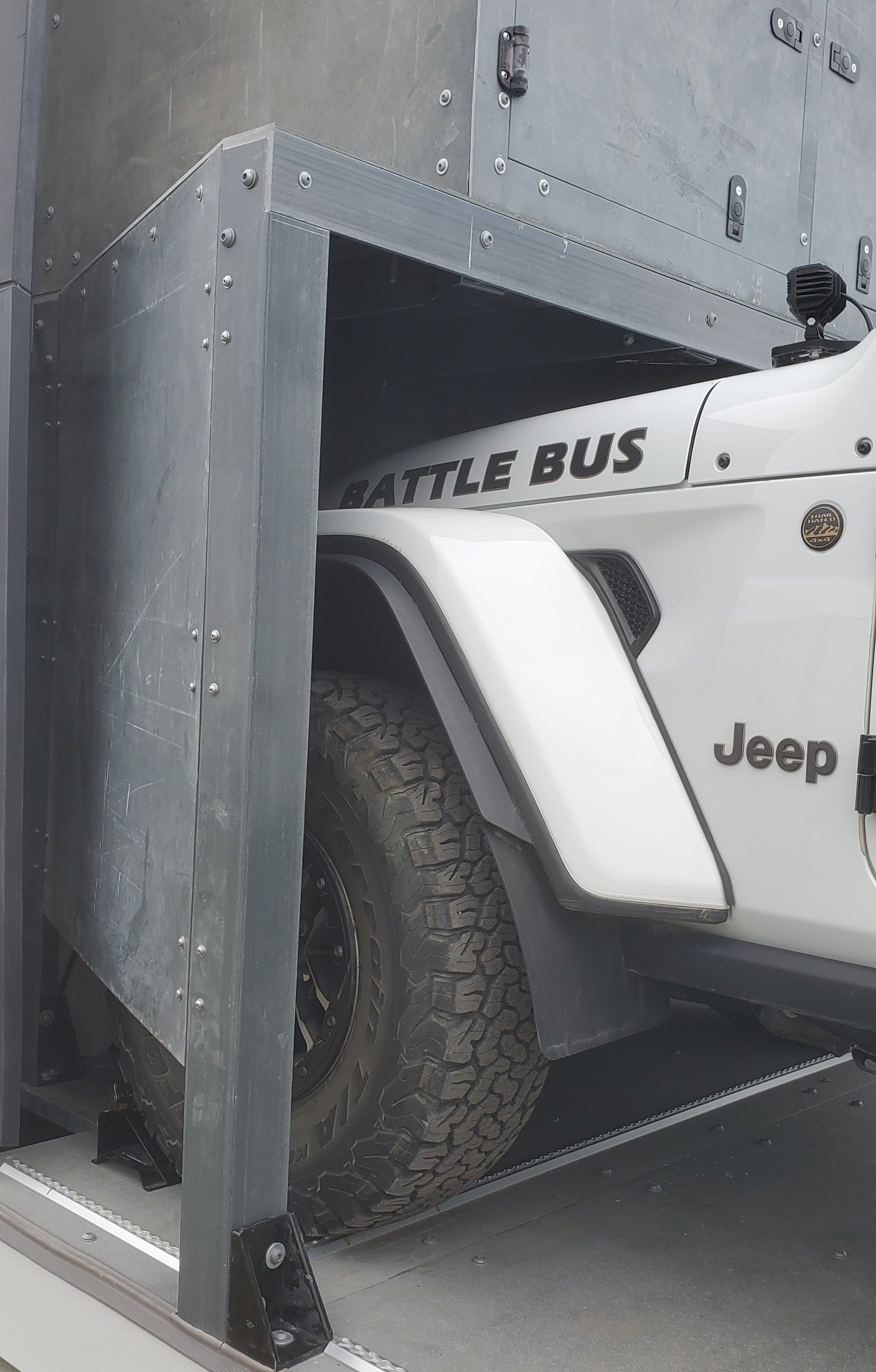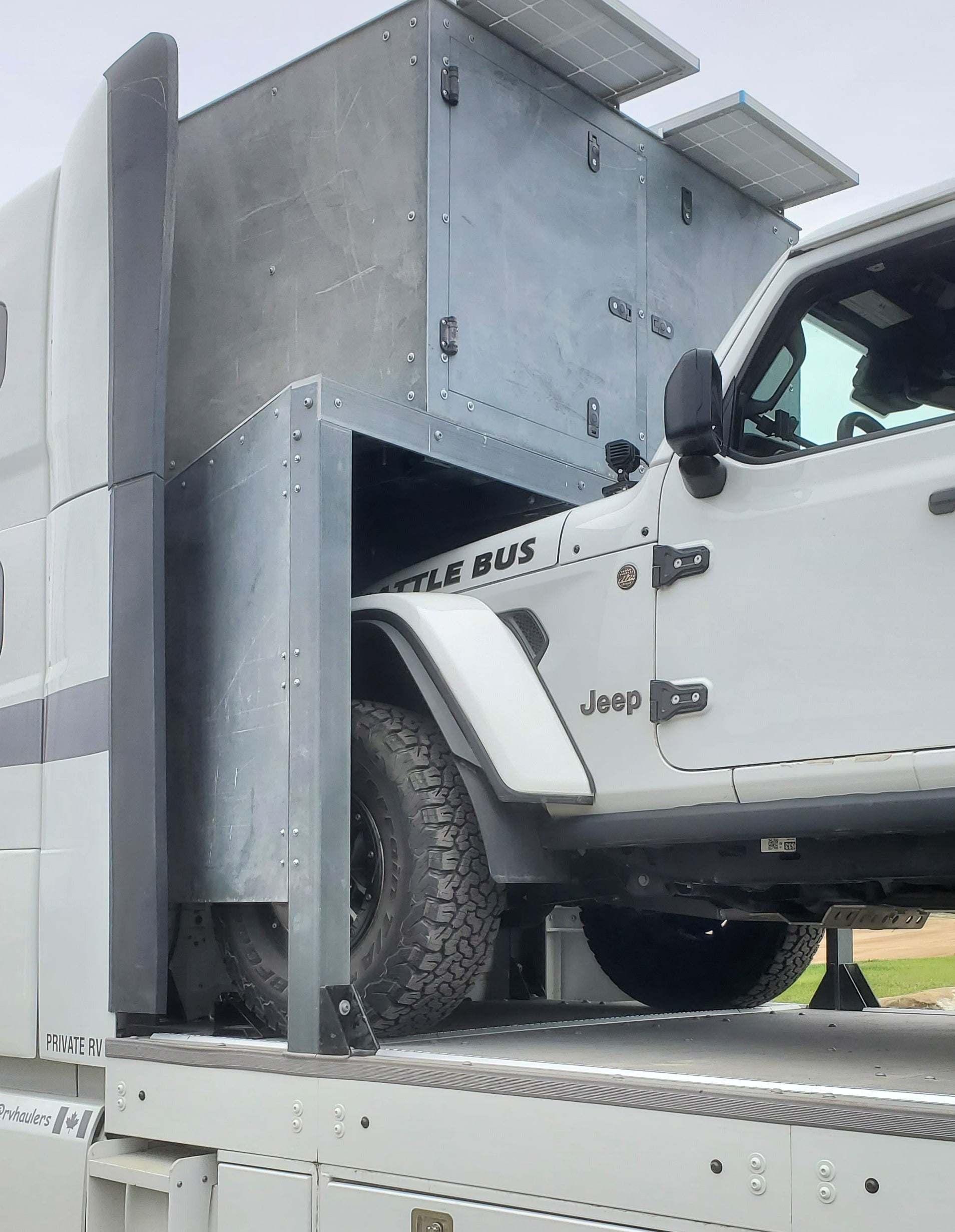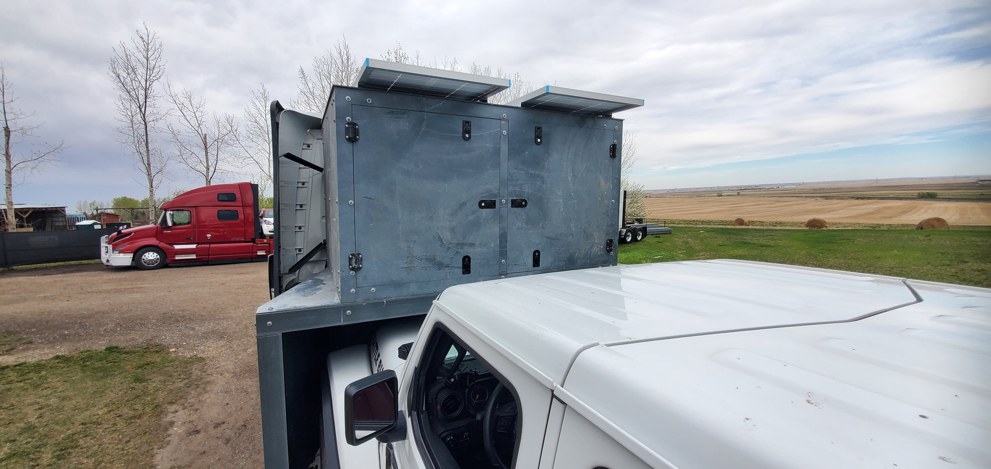 DIMENSIONS - The entire assembled OverHood CANDrom Cabinet shown here is 6 feet wide nearest the back of the cab, overall 8 feet tall, and 44 inches deep. The top surface is great for mounting solar panels. The wide opening front face of the drom “table” structure is 101 inches wide. This allows you to drive even a tall a lifted Jeep under the cabinet. The OverHood CANDrom storage cabinet itself is 42 inches tall, 44 inches deep, and 6 feet wide. This is a MASSIVE 77 cubic feet of storage.