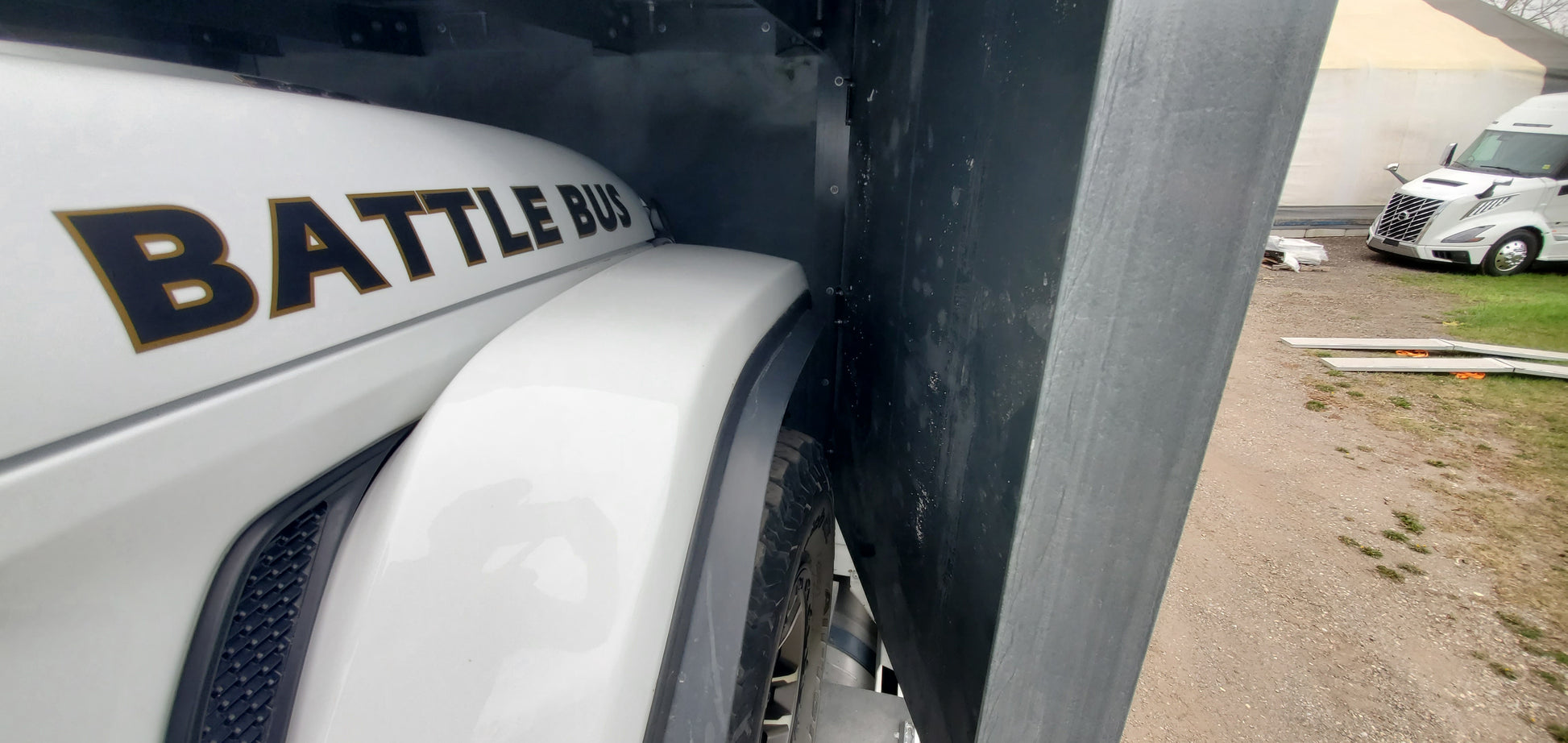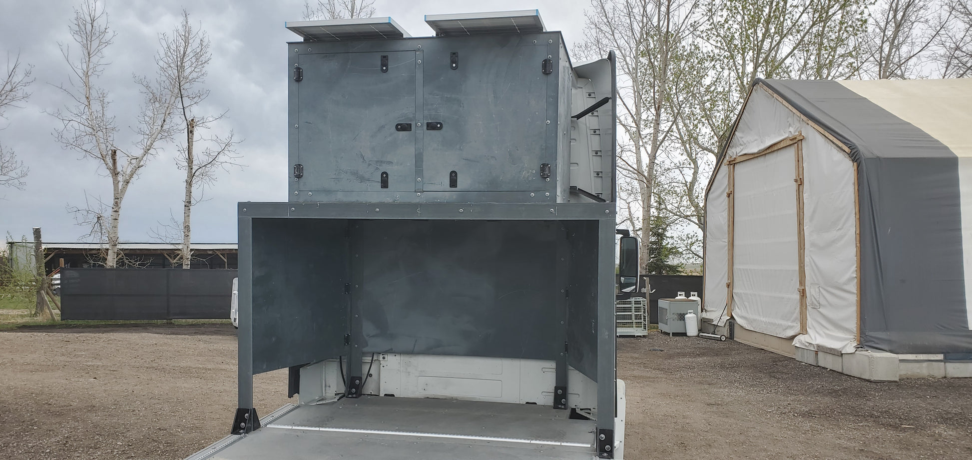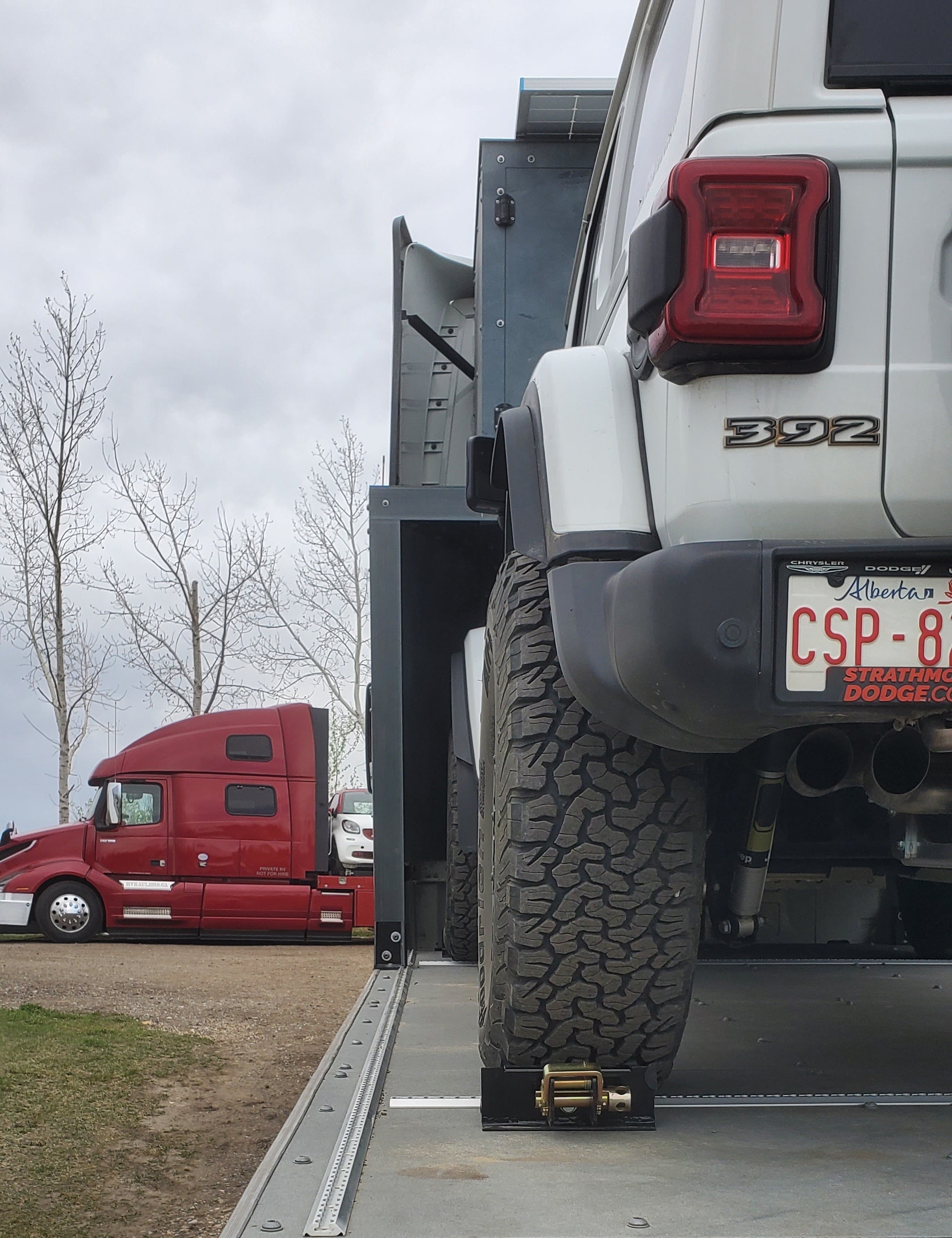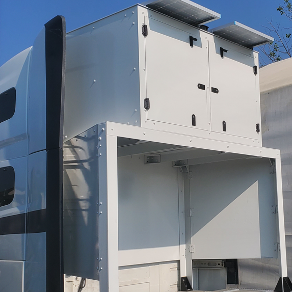 DIMENSIONS - The entire assembled OverHood CANDrom Cabinet shown here is 6 feet wide nearest the back of the cab, overall 8 feet tall, and 44 inches deep. The top surface is great for mounting solar panels. The wide opening front face of the drom “table” structure is 101 inches wide. This allows you to drive even a tall a lifted Jeep under the cabinet. The OverHood CANDrom storage cabinet itself is 42 inches tall, 44 inches deep, and 6 feet wide. This is a MASSIVE 77 cubic feet of storage.